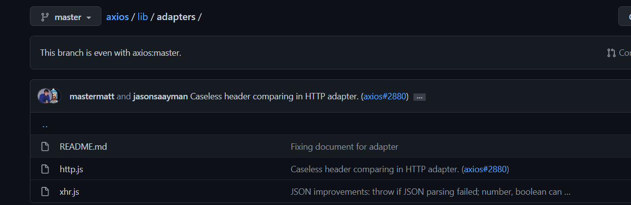 cancel dir의 경우 axios cancel 기능들, helpers dir는 헬퍼 함수 그리고 utils.js는 그런 헬퍼 함수들이나 타입 체크 등의 말 그대로 유틸, core가 axios 핵심 로직들 그리고 adapters가 aixos의 통신 방식을 담당한다. 일일이 해당 부분들을 포스팅하자니 너무 길어지니, 간략히 말하면 axios 자체는(core) promise 핸들링에 대한 내용이 주 내용이었고, adapters의 내용이 바로 ajax 요청에 대한 내용이었다.