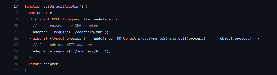 따로 사용자가 어뎁터 패턴에 따른 어뎁터를 설정하는게 아니라면 axios의 기본 제공 adapters는 2개로 각각 http와 xhr이다. default 설정에서 확인할 수 있듯이 브라우저에서는 xhr를 node에서는 http adapters를 사용한다.