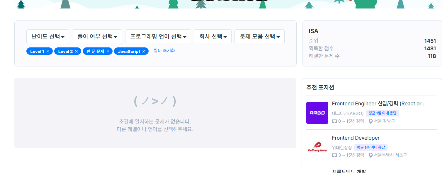 현 시점에서 프로그래머스 1레벨, 2레벨, 자바스크립트 문제를 모두 풀었을때 총 문제 수는 118문제이고, 1481점이다.