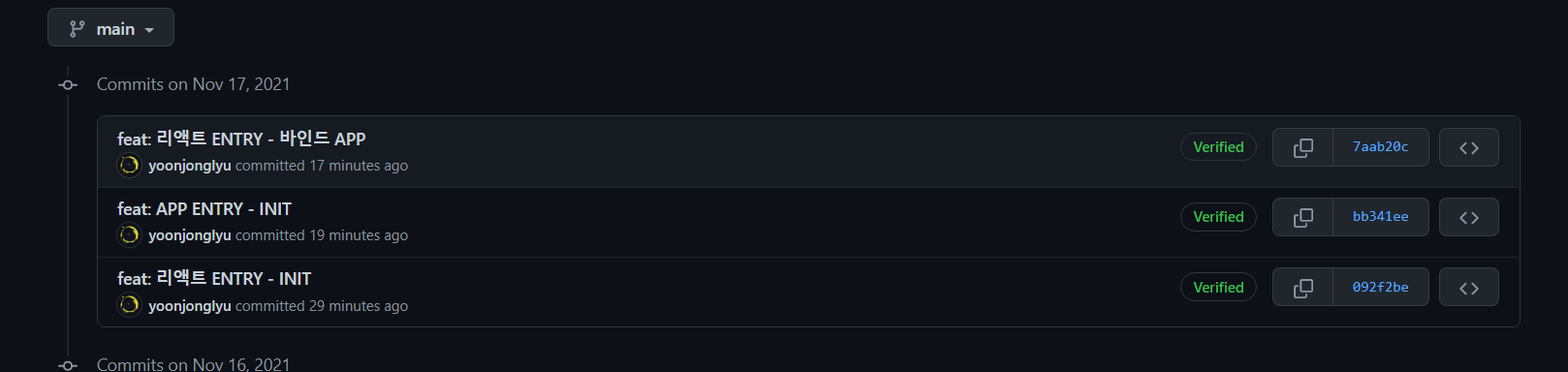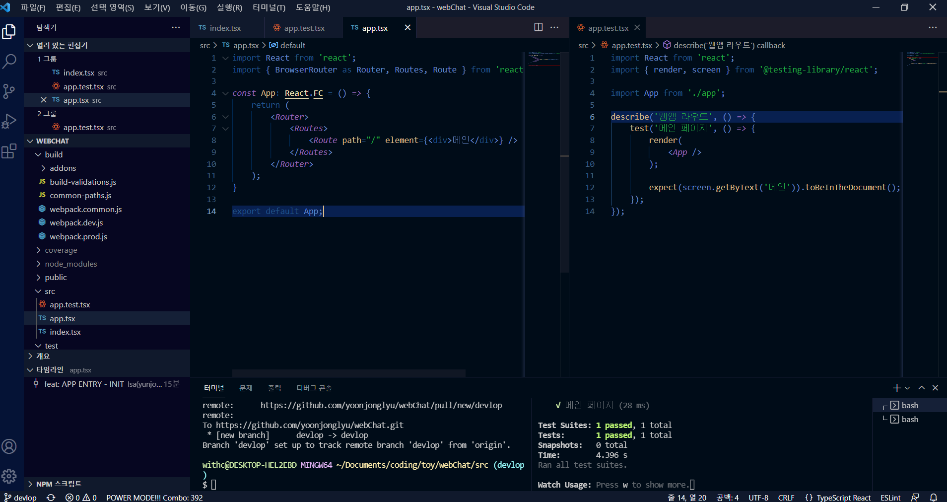 커밋은 3 커밋으로 나누어서 진행했다. index.tsx를 먼저 작성한 게 1 커밋 app.test.tsx 와 app.tsx를 작성하는 게 1 커밋 또 app.tsx와 index.tsx를 바인딩하는데 1 커밋을 했다.