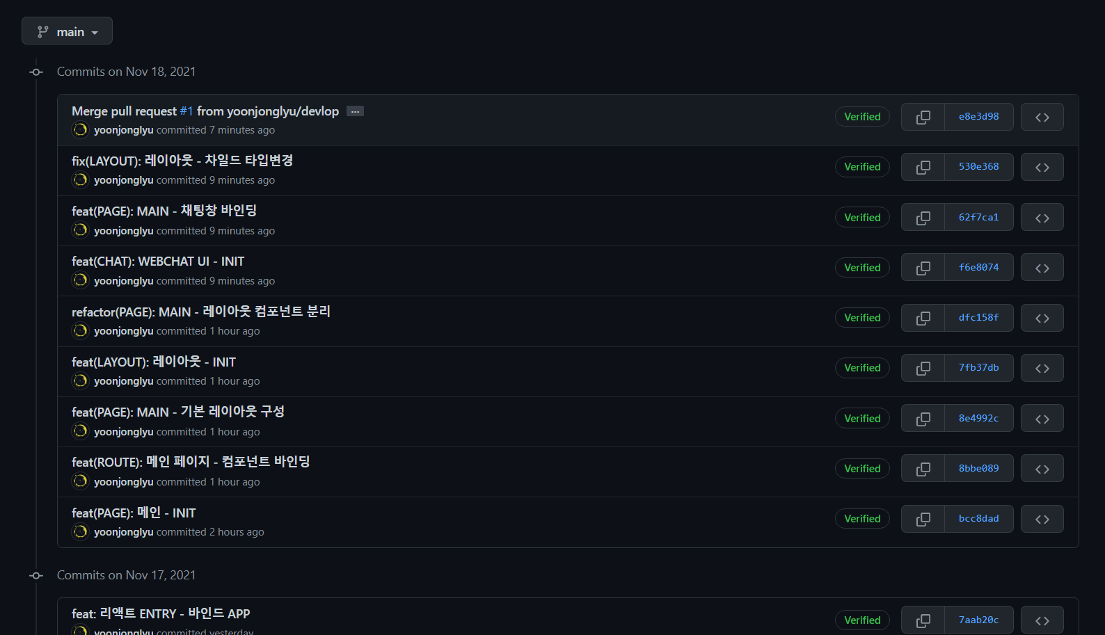 스타일의 경우 채팅창 소켓 통신에 대해서 어느 정도 구현을 마친 후 기획에 따라서 구현하기로 정했기에 비교적 간단한 작업이었다. 작업에는 총 8 커밋이 소요되었다.