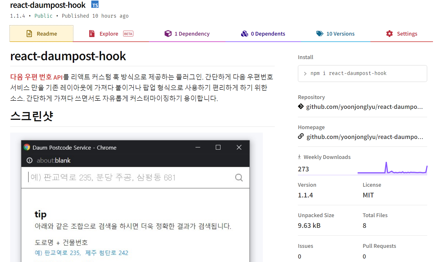 그렇게 배포한 첫 오픈소스인 react-daumpost-hook
