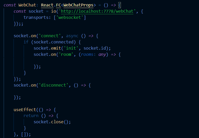 채팅창 자체는 저번의 구조에서 크게 달라질게 없었지만 채팅창의 메시지를 서버에서 받아서 렌더링 해주는 부분이나, 메시지 전송부분을 구현하면서 예상했던대로 소켓 연결에 대한 리렌더링 이슈가 있기에 해당 부분들을 따로 자식 컴포넌트로 만들어서 분리해주었다. 그렇지 않다면 리렌더링시 마다 소켓연결에 대한 로직을 재실행하면서 에러가 발생하는 이슈가 있다.
