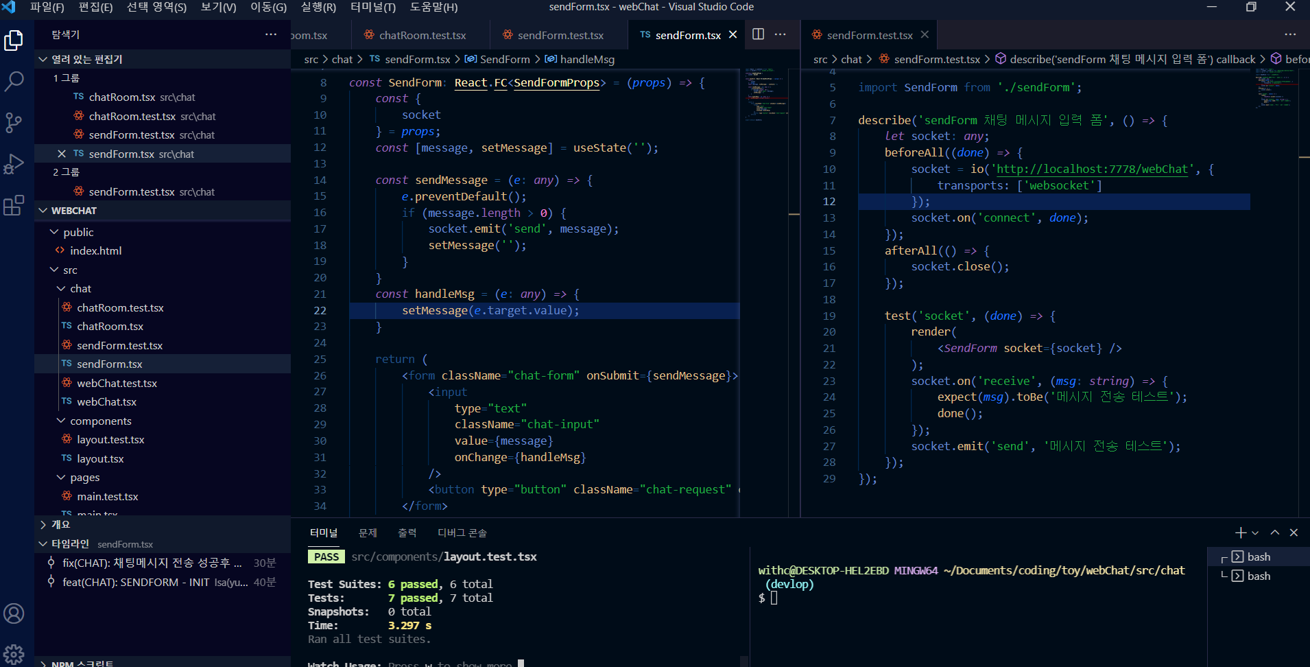 socket.io에 대한 테스트코드를 작성하면서 비동기 및 소켓 통신에 대한 테스트 코드가 처음이다 보니 많이 어려웠다. 사실 기본적인 로직의 경우 별거 없기 때문에 로직구현보다 테스트 코드 작성에 시간을 더 많이 소요했다.