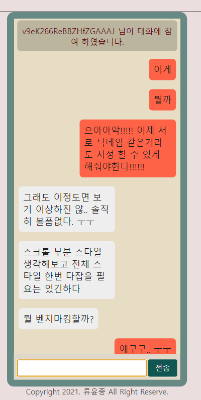 채팅창 시스템 메시지로 채팅 입장과 퇴장에 대한 알림을 넣었다. 그리고 기존 스타일들을 이제 어느 정도 잡아 줘야하기에 색배합에 관한 사이트를 참고하면서 세부적인 스타일을 잡아줬다. 솔직히 너무 볼품없긴하다. 디자인 고자가 CSS프레임워크를 쓰지 않다보니 그런듯 분명히 카카오톡을 나름 벤치마킹 했는데 문제는 전혀 그런 느낌이 안든다.