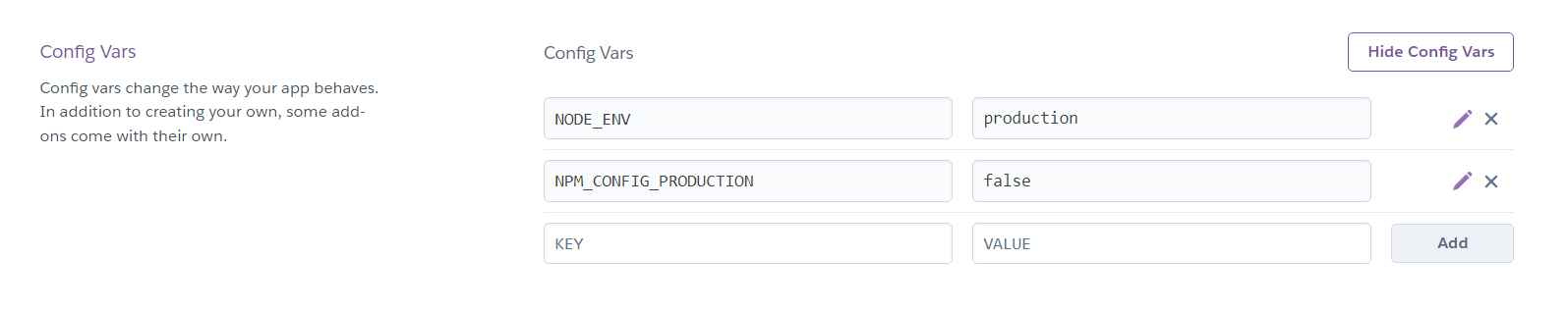 web이라는 명령어로 start:prod명령어를 실행하는 것과 그전에 파일들을 최신화하는 것이다. 이후 실행되는 start:prod의 경우 dist/main을 노드 서버로 실행하는 명령어다. 추가로 헤로쿠 설정에서 config를 추가해줄 필요가 있는데 컴파일하는 과정에서 환경변수나 npm config에 대한 부분을 설정하는 config다.