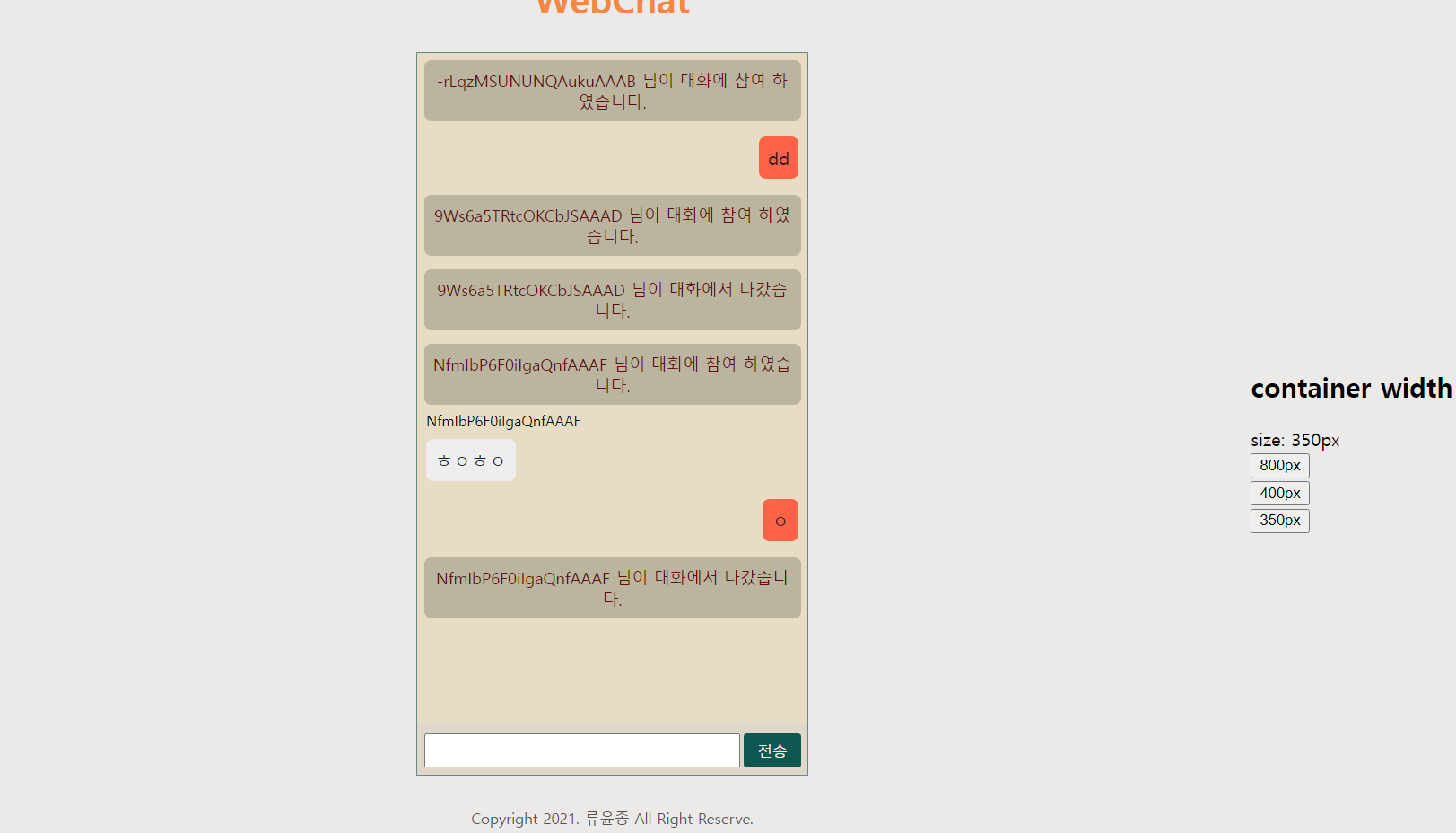 추가적으로 채팅 모듈이 아닌 데모버전에서는 width사이즈를 3가지를 선택하여서 채팅창이 반응형으로 변하는 것을 볼 수 있도록 추가했다. 기본적으로 채팅창 구성요소는 모두 플렉스 레이아웃에 반응형을 기준으로 했기 때문에 극한의 디바이스 환경이 아닌 이상 어디서든 무난하게 맞춰진다.