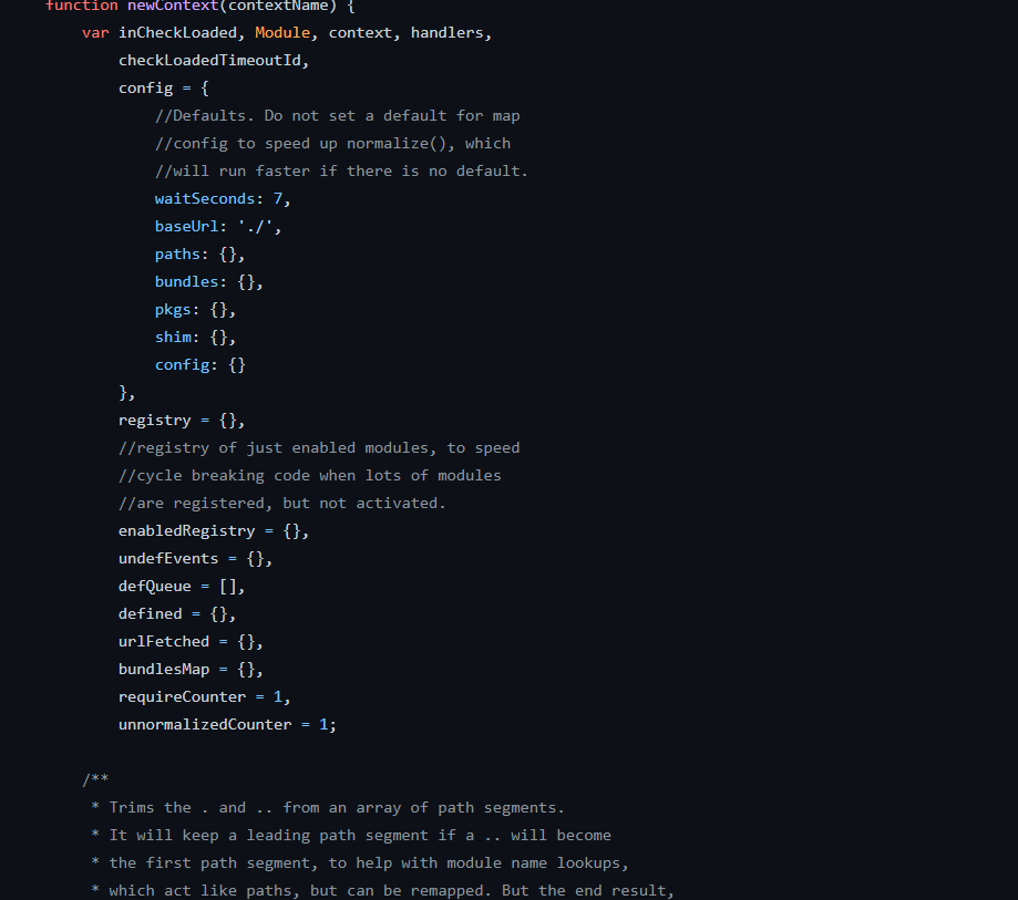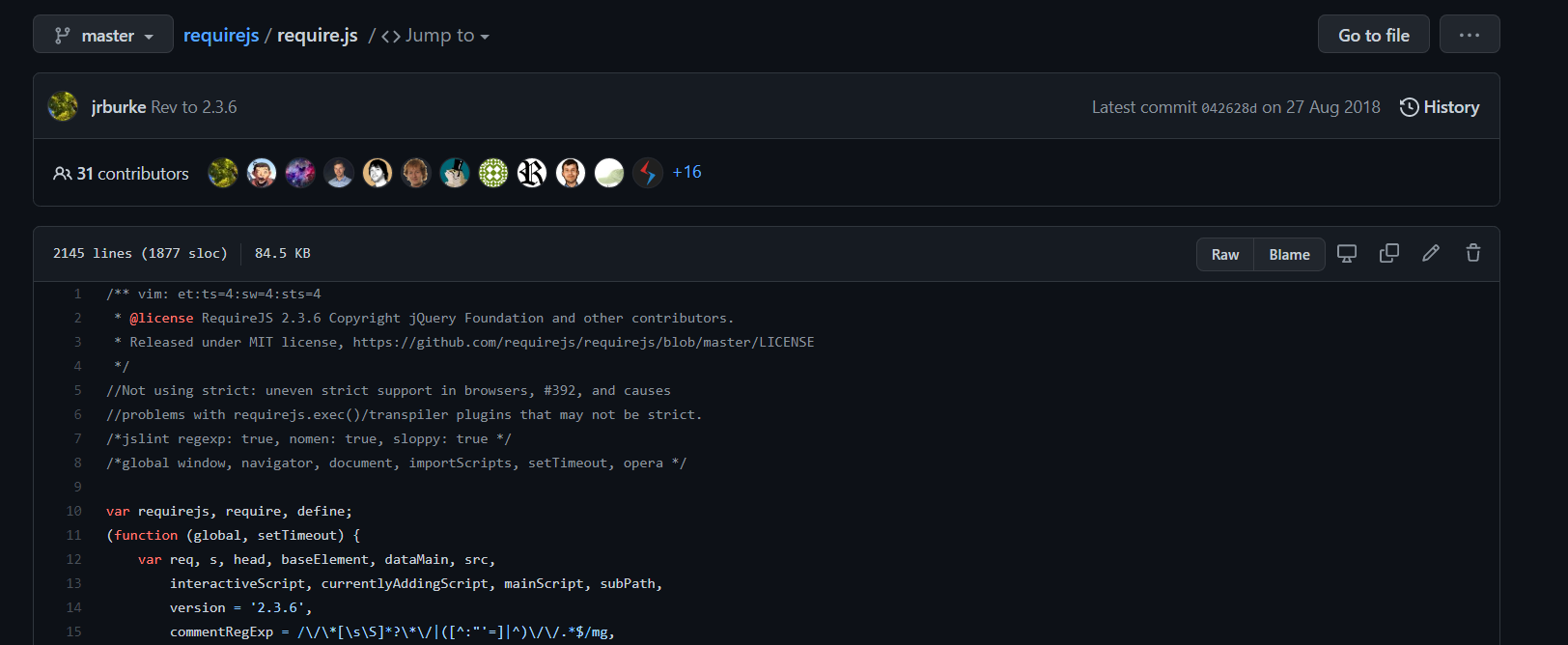 해당 소스는 먼저 해당 Repo의 require.js라는 파일에서 확인 가능하다. 자바스크립트 모듈 시스템이 제대로 자리 잡기 전이라 그런지(애초에 Require JS 자체가 그 모듈 시스템중 하나이다.) 하나의 파일에 2145라인으로 모든 소스가 통합 되어 있다. 솔직히 이점이 해당 오픈소스를 분석하는데 가장 큰 난관이였다.