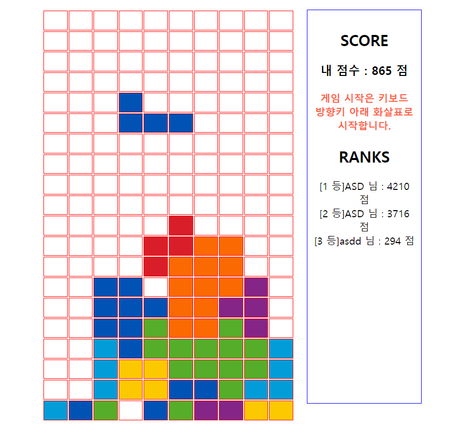 이렇게 테트리스 공식 사이트와 여러 문서를 참고해서 js DOM조작을 통해서 간단히 테트리스를 만들어 보았다.