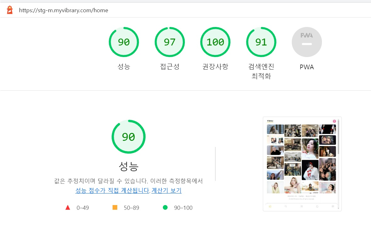 보통 관리 가능한 포인트에서는 100에서 90점을 유지하는데 오픈소스를 활용하는 경우나 디자인적인 측면이 문제가 되는 경우가 꽤 있어서 그런 경우를 고려한다해도 매 항목당 점수가 80점대 이하로 내려갈 경우 최적화등을 고민해야 하지 않을까?라는 생각이 있다.(라이트하우스 기준)