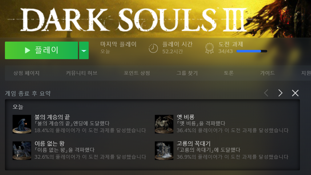 DLC를 살까 하다가 그냥 귀찮아서 회차 초기화를 했다.. 하얗게 불태웠다. 기량캐로 타도랑 혼돈의 칼인가로 방패 없이 끝까지 깨고 나니 뭔가 지치는 느낌? 게임인데 노동을 한거 같다. ㅎㅎ pvp나 2회차는 담 기회에 해봐야지 한동안 다크소울을 실행시킬 일은 없을듯하다. 그래도 나중에 꼭 만렙까지 찍어봐야지..