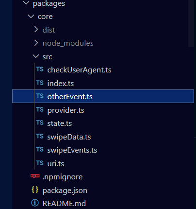 react-custom-swipe의 경우 react custom hook과 swipe 라는 react 컴포넌트 두가지 구성으로 swipe 로직을 제공한다. 사실 제공하는 방식이 react기반이다보니 react와 결합도가 필연적으로 높을 수 밖에 없었는데 swipe 기능 자체는 SPA앱 전의 제이쿼리 기반의 구버전 웹사이트에서부터 개발된 기능이다 보니 해당 로직들이 react에 종속성을 가질 필요는 없었다. 그래서 swipe 로직들을 따로 core라는 부분으로 추출하여서 정리하고 추후 다른 파생 라이브러리나 프레임워크들에 사용하기 위해서 패키지화를 해뒀다. package 이름은 swipe-core로 하고 싶었으나 이미 선점자가 있는 관계로 swipe-core-provider로 지었다.