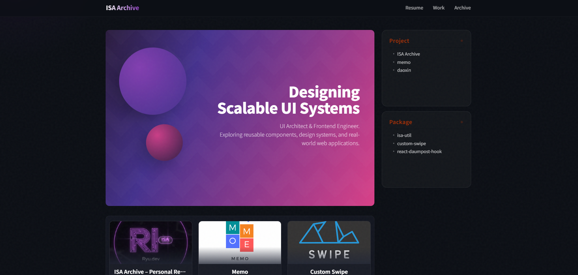 ISA의 개인 아카이브입니다. UI 아키텍처, 컴포넌트 시스템, 유틸 라이브러리, PWA 등 실제 제품 중심의 작업을 기록합니다.
